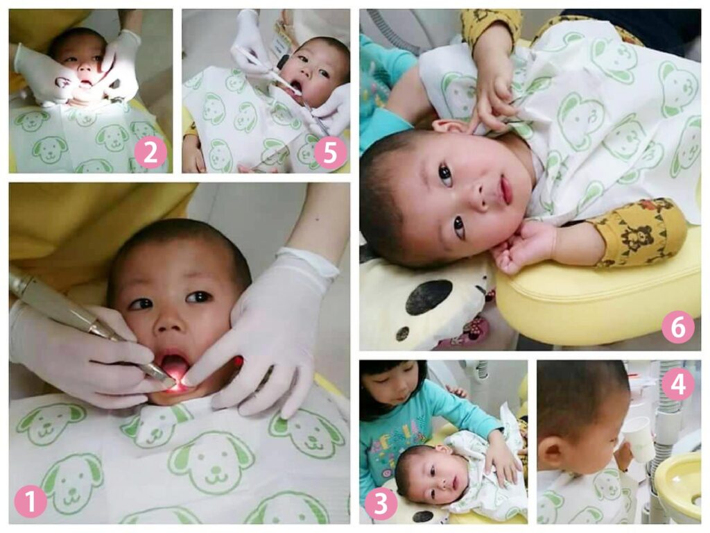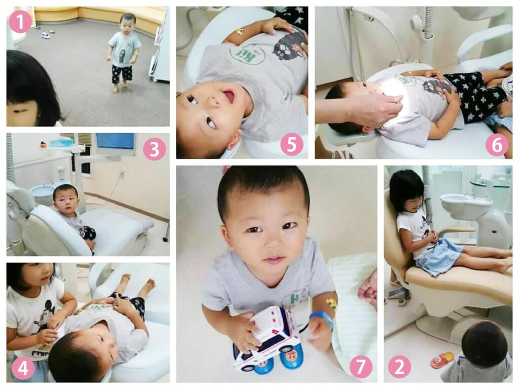 ⑤⑥フッ素塗布もがんばり、治療用イスの上でハイポーズ♪